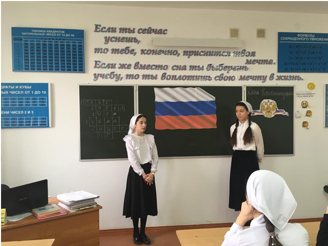 11.12.2019В целях популяризации идеи единения многонационального народа Российской Федерации через любовь к Родине, к народу, к истории, согласно плану работы школы 7 декабря 2019 года учителем Мамаевой З.Ш. в 8 «А» классе было проведено открытое мероприятие «Я-гражданин России», посвященное Дню Конституции РФ. На мероприятии присутствовали: педагог-организатор по ДНВ Икаев Х.М., ЗВР Игачева И.С. В начале мероприятия прозвучал Гимн РФ и ЧР , стихотворение о великой Родине, о правах человека, о Конституции РФ. После этого Зарета Шаитовна кратко напомнила ребятам о том, что такое Конституция РФ, когда она была принята, что провозглашает.