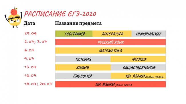 Единый госэкзамен в этом году начнется 29 июня и закончится 20 июля. Он пройдет в традиционной форме, но с соблюдением всех мер эпидемиологической безопасности: выпускников на входе в аудиторию ожидает измерение температуры, им раздадут маски и перчатки и рассадят в 1,5 м друг от друга.ЕГЭ по русскому языку пройдет в два подхода - 2 и 3 июля, по математике - 6 июля, истории и физике - 9 июля, обществознанию и химии - 13 июля. 16 июля будут сдавать экзамен по биологии и письменную часть ЕГЭ по иностранным языкам, устную часть по иностранным языкам - 18 и 20 июля. В расписании будут обозначены резервные дни для сдачи ЕГЭ по всем предметам.Обязательных экзаменов в 2020-ом не будет (это касается и ОГЭ для девятиклассников). Сдавать их нужно тем, кто намерен поступать в вузы, остальным оценки в аттестат выставят по итогам года.Есть хорошие новости для будущих студентов: в учебных заведениях появятся 11 тысяч дополнительных бюджетных мест по приоритетным специальностям. Такое решение принято, чтобы абитуриенты поступили в выбранные вузы и не потеряли целый учебный год. Остальные учащиеся школ и институтов вернутся к обычному формату образования сразу после завершения режима введенных ограничений. Онлайн-обучение останется дополнением традиционного процесса.