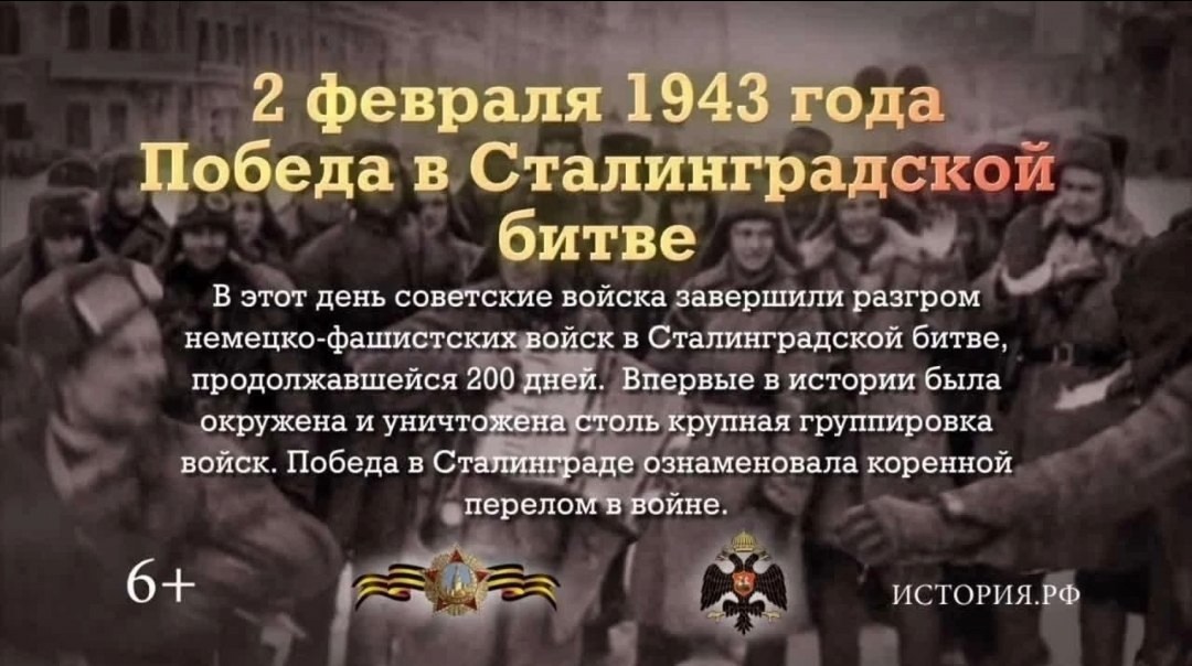30.01.2025День воинской славы.День разгрома советскими войсками немецко-фашистских войск в Сталинградской битве (1943 год) отмечается в России ежегодно 2 февраля.