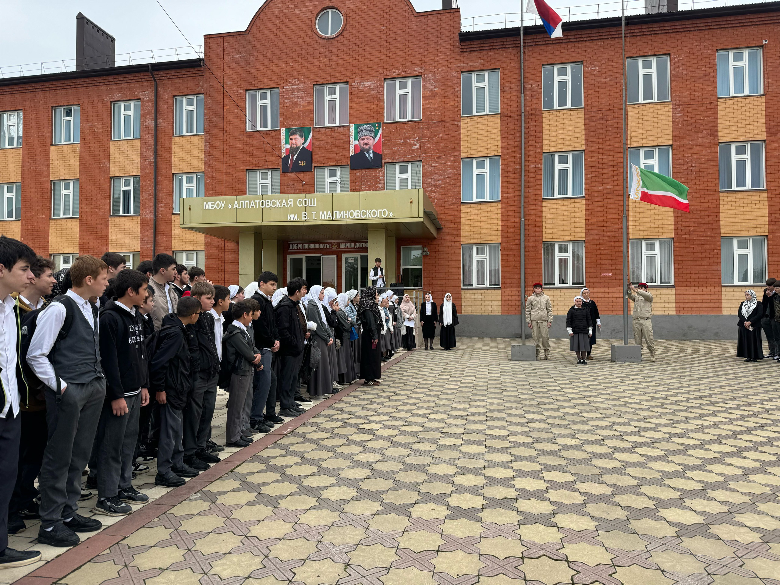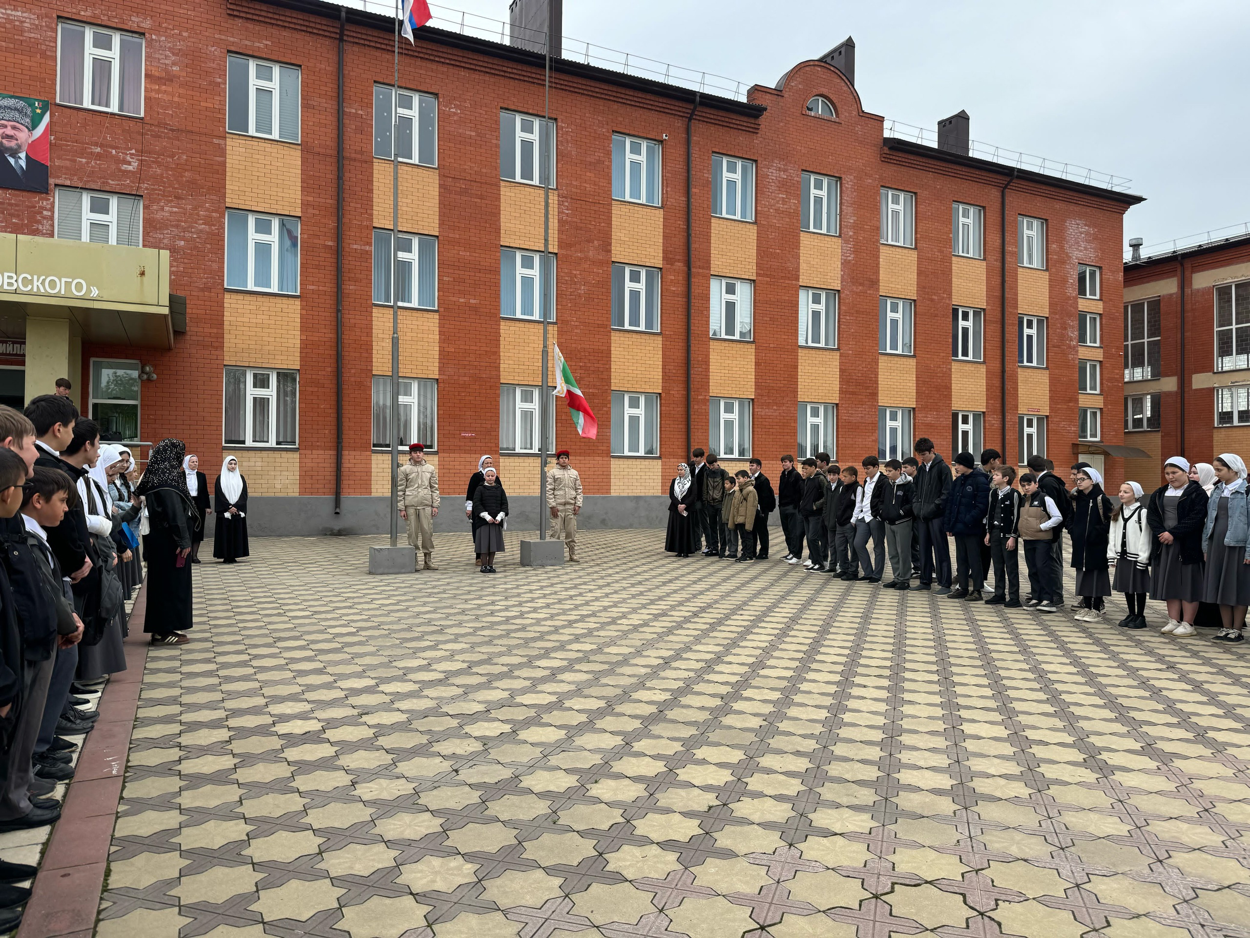 Почетное право поднять флаг предоставлено участникам ВПК "Нохчо" Джандарову Арсению и Кубачеву Рахману. Тема линейки:"1 Мая - Праздник Весны