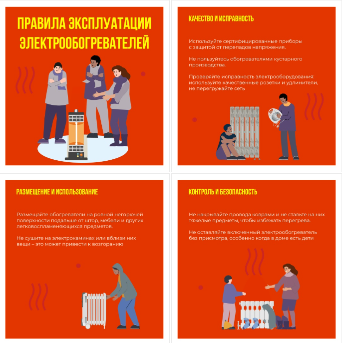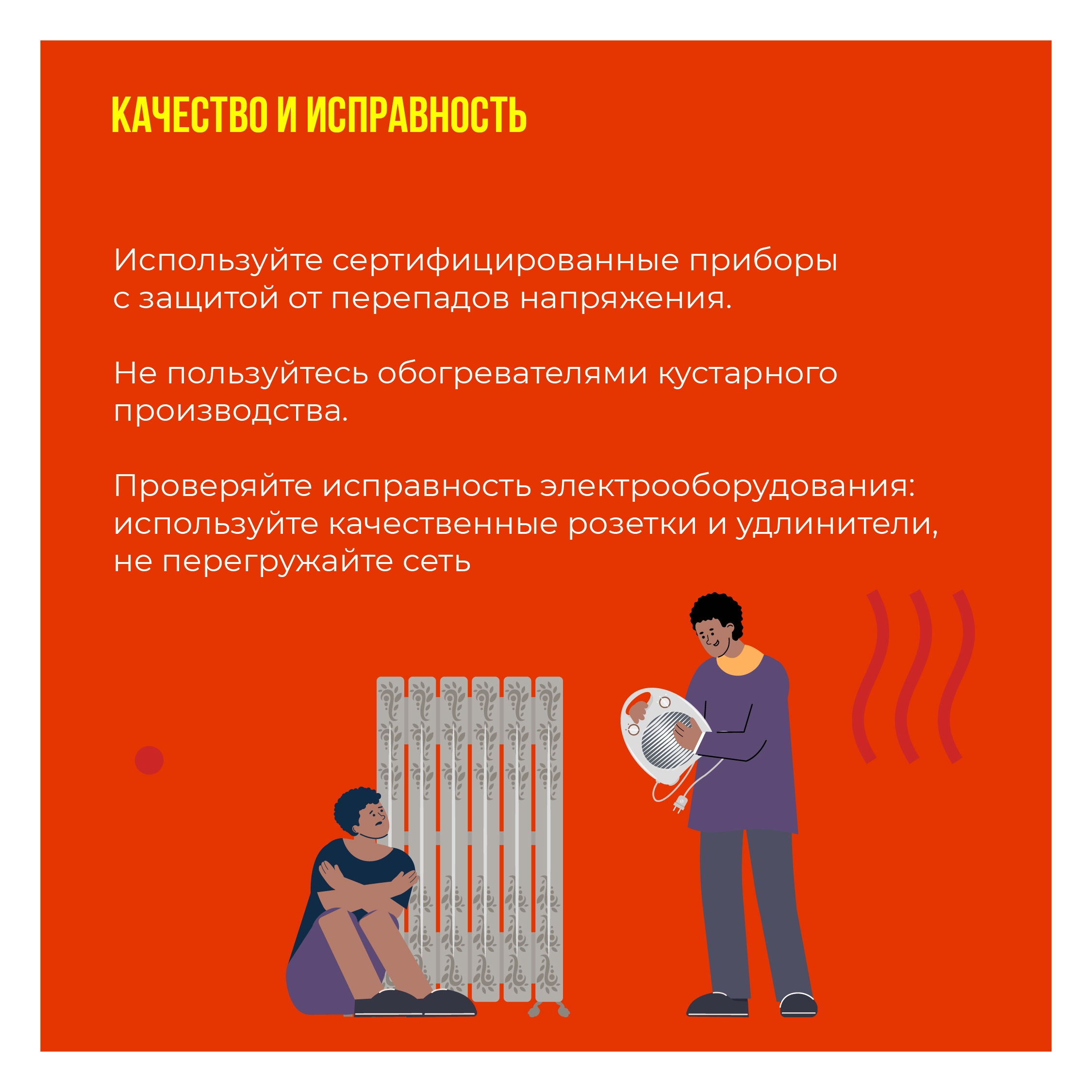 Часто источником становятся не только газовые приборы, но и электрообогреватели, а также перегрузки электросети. В карточках собрали для вас рекомендации по безопасной эксплуатации электрообогревателей.